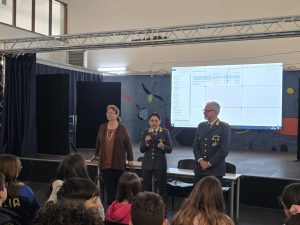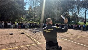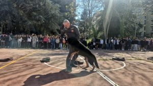 Nella prima parte – di educazione alla legalità economico/finanziaria – sono stati illustrati alcuni principi basilari sulla regolarità fiscale ed il contrasto alla contraffazione; i ragazzi di scuola secondaria (II medie) hanno posto varie domande e sono state soddisfatte alcune curiosità. Nella seconda parte sono stati riuniti circa 250 ragazzi di II e III sec. nel campo sportivo polivalente posto all’esterno ed è stata offerta una dimostrazione delle attività di controllo antidroga negli aeroporti con alcune esercitazioni delle unità cinofile di Ciampino.